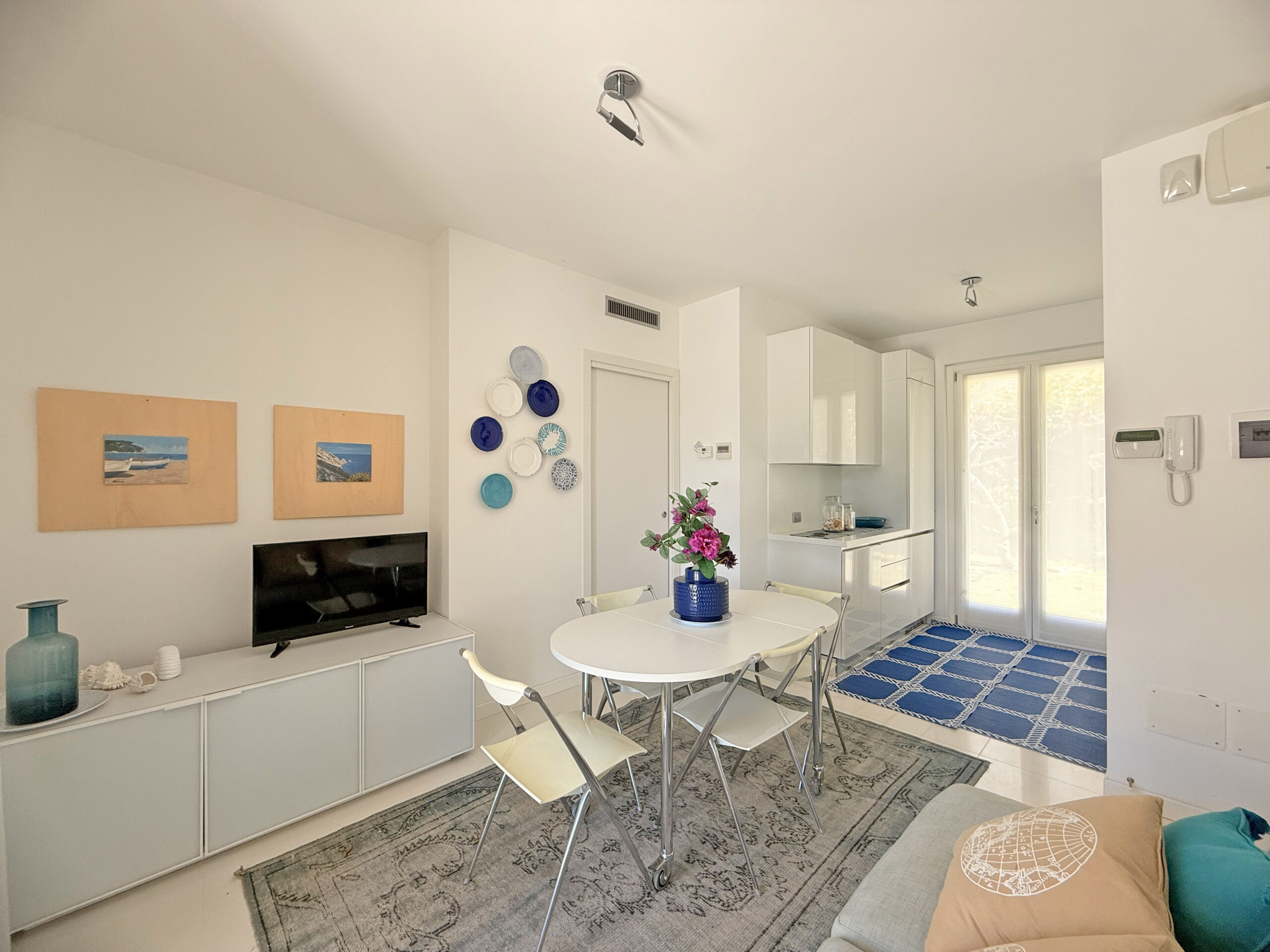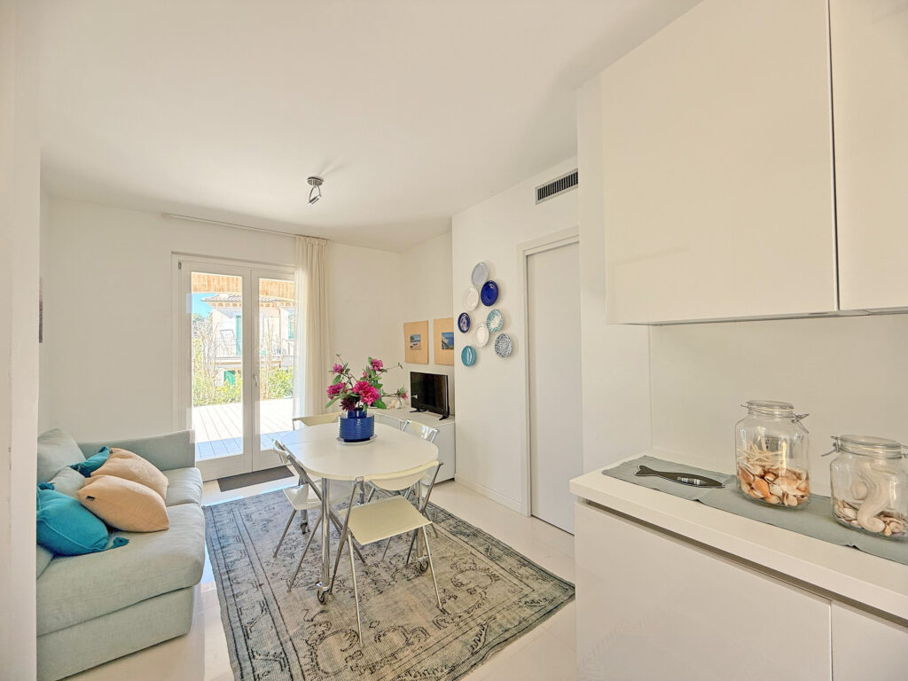 la zona living è accogliente e luminosa, grazie alla porta finestra, che dà sul portico, e alla cucina abitabile con porta finestra con accesso sul giardino.