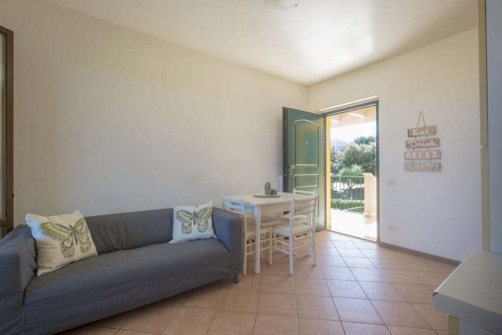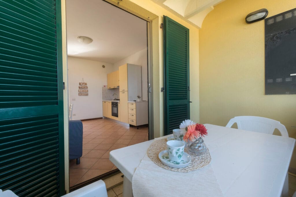 L’immobile si trova al primo piano e offre un luminoso soggiorno con cucina a vista, il quale si affaccia su un balcone perfetto per rilassarsi e pranzare all’esterno con l’arrivo della bella stagione.
