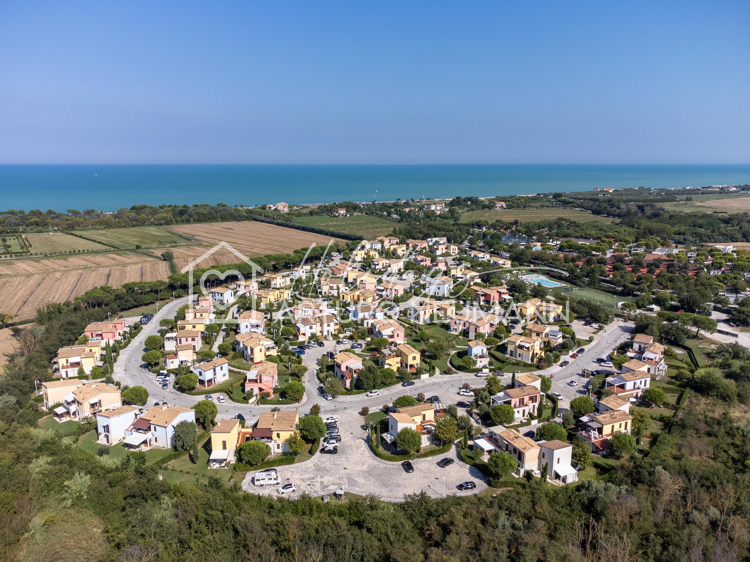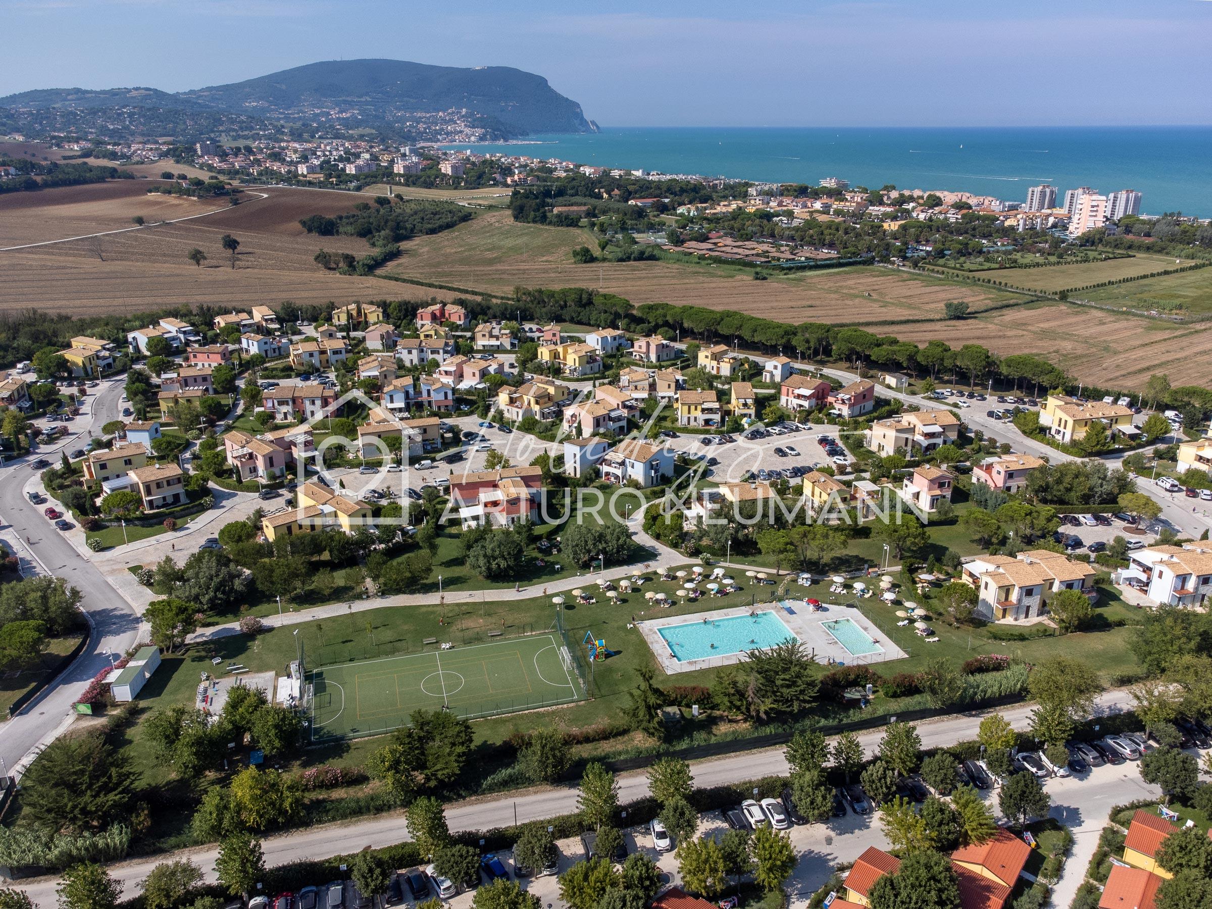 Il complesso di per sé è dotato di ingresso riservato con telecomando, videosorveglianza, portineria, di due piscine (una per adulti e una per bambini), di solarium con ombrelloni e lettini, di 1 campo da tennis/da calcetto, di un’area giochi per bambini e di un bar. All’esterno del cancello c’è la fermata della navetta comunale estiva, gratuita per residenti e turisti, utile per raggiungere la spiaggia e comodissima per raggiungere Marcelli centro e Numana centro.