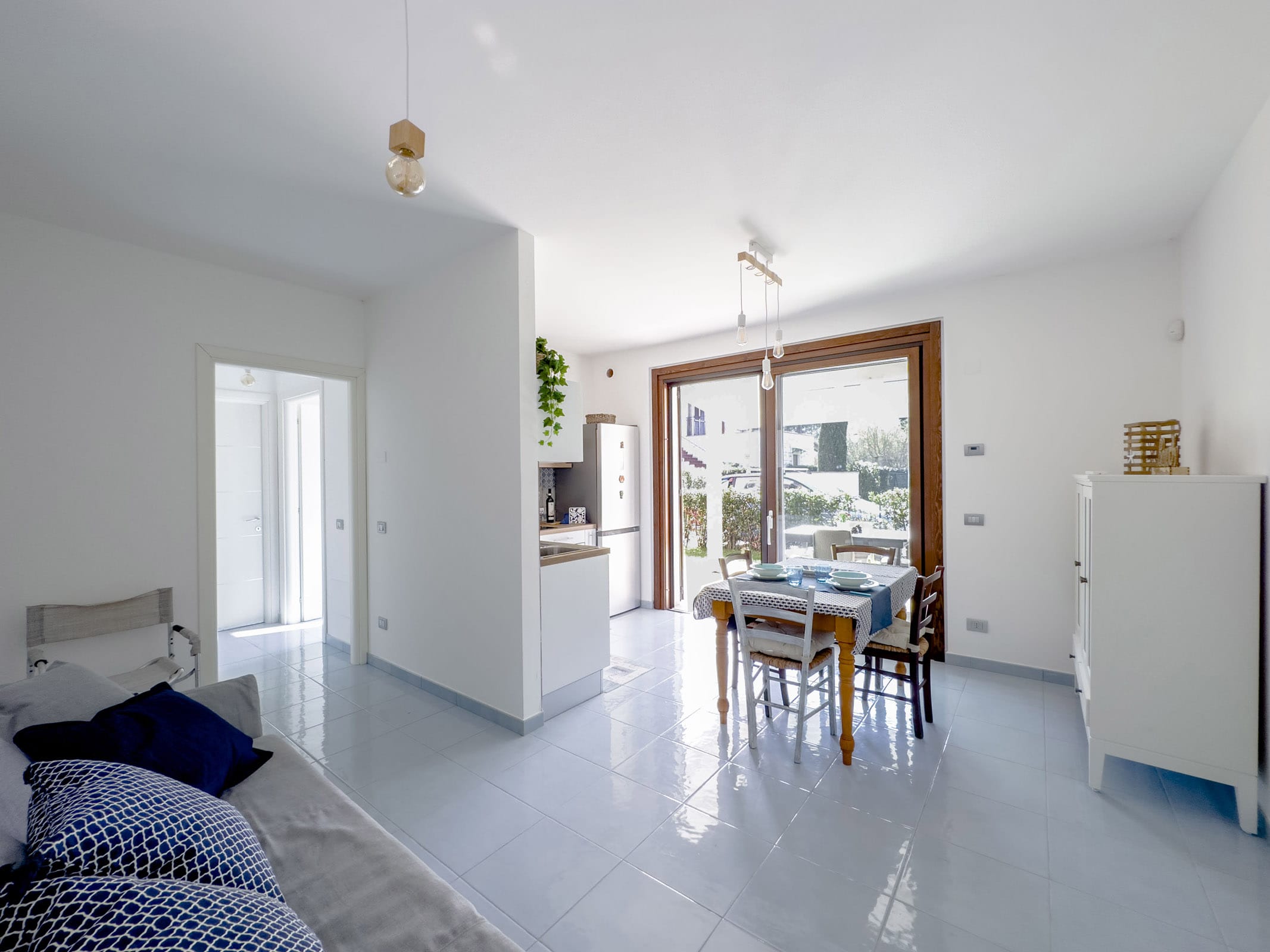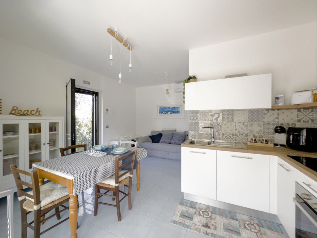 Internamente l’appartamento presenta un luminoso soggiorno con cucina a vista. La camera matrimoniale gode di un accesso diretto al giardino, creando un ambiente intimo e privato. Completa la dotazione un bagno con box doccia e un pratico ripostiglio con zona lavanderia.