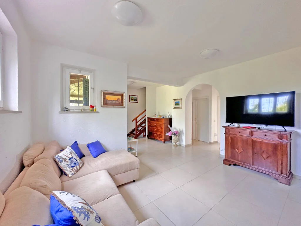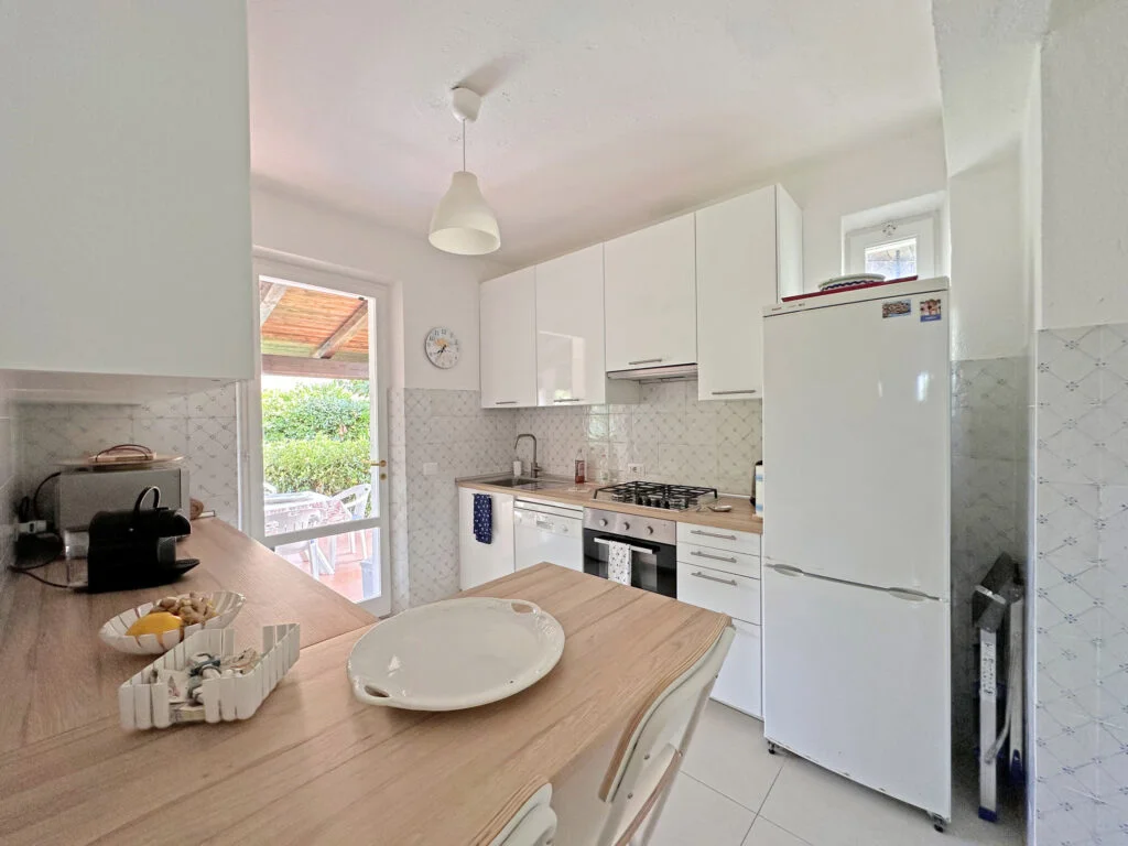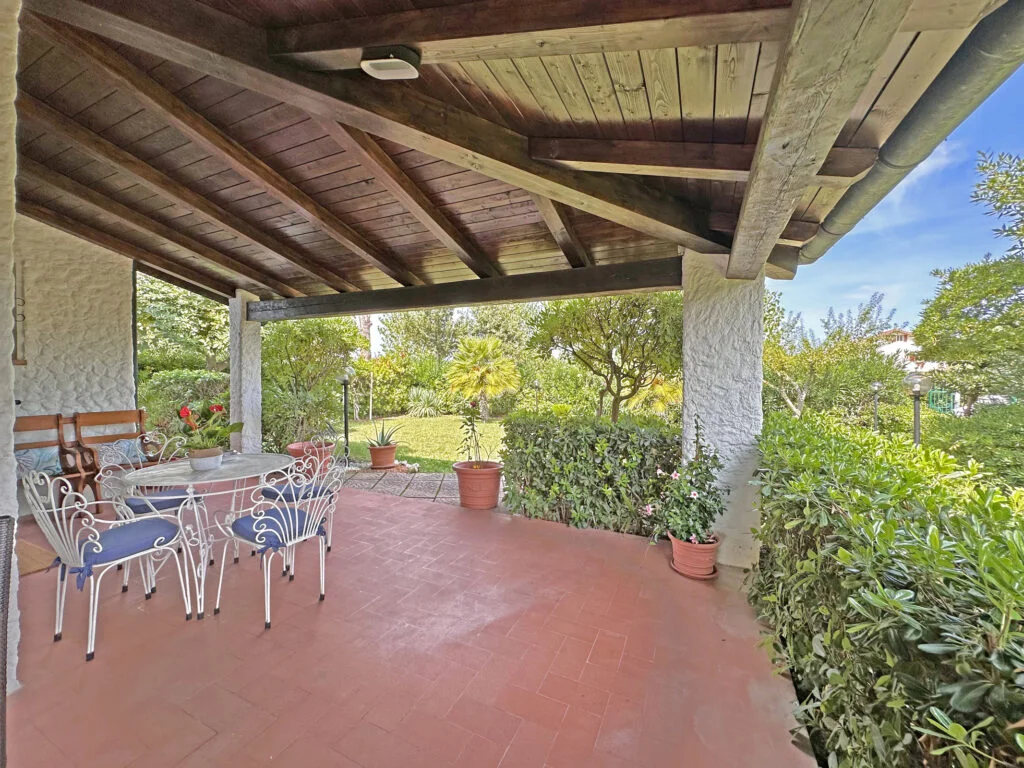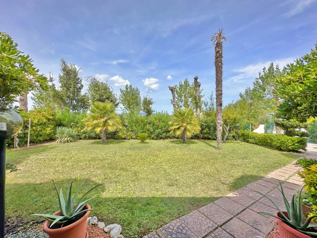 Si presenta all’ingresso con 2 posti auto interni e con un giardino di 500 mq. con doccia esterna.