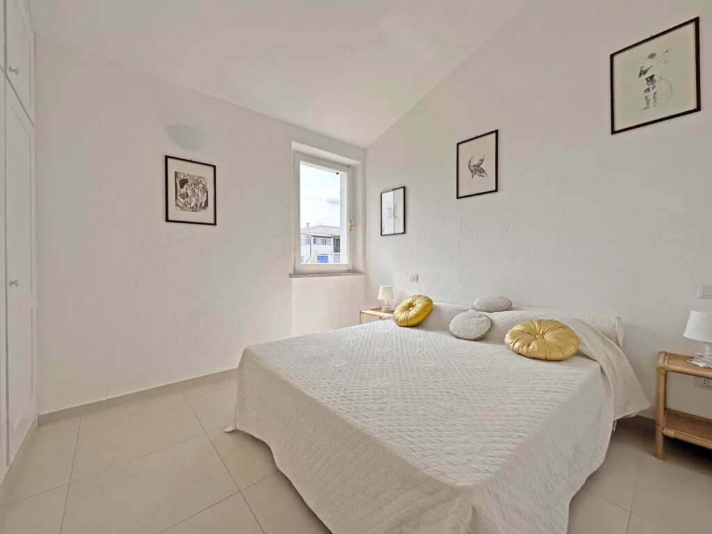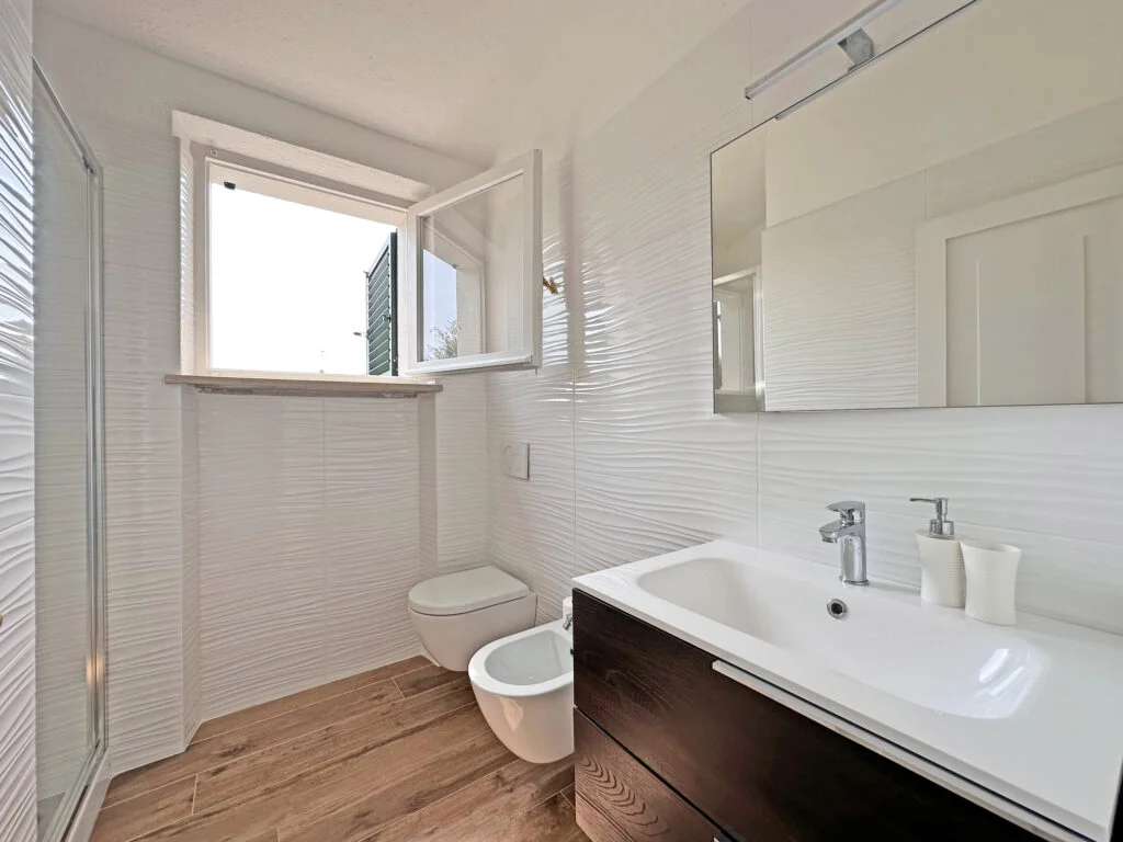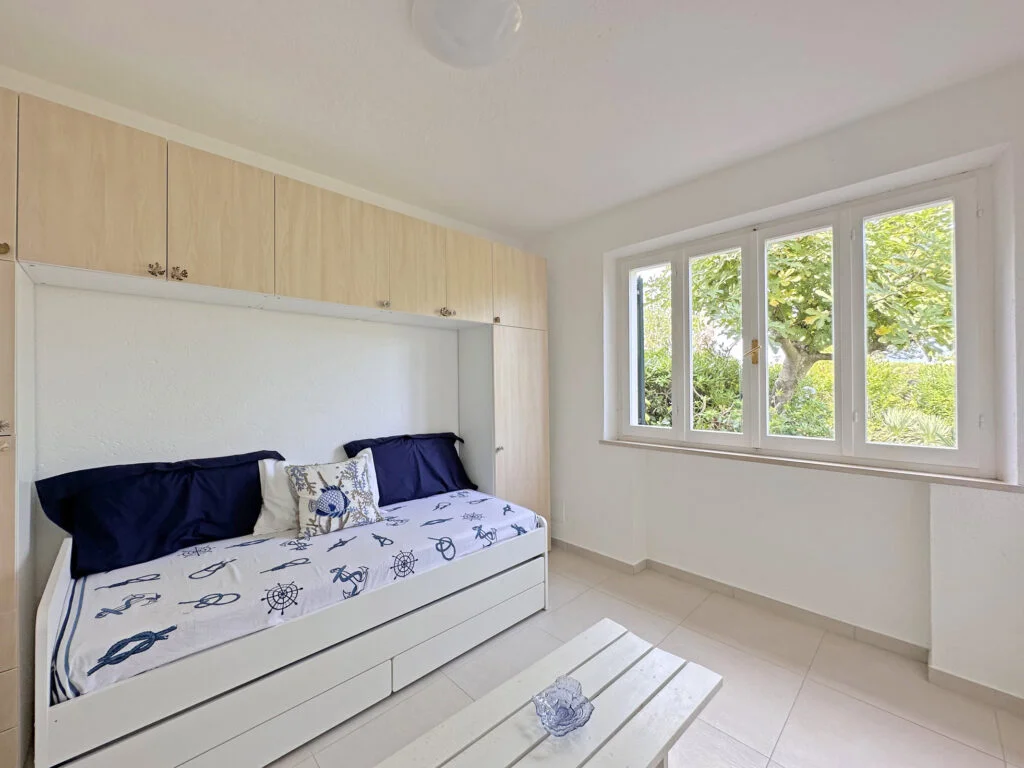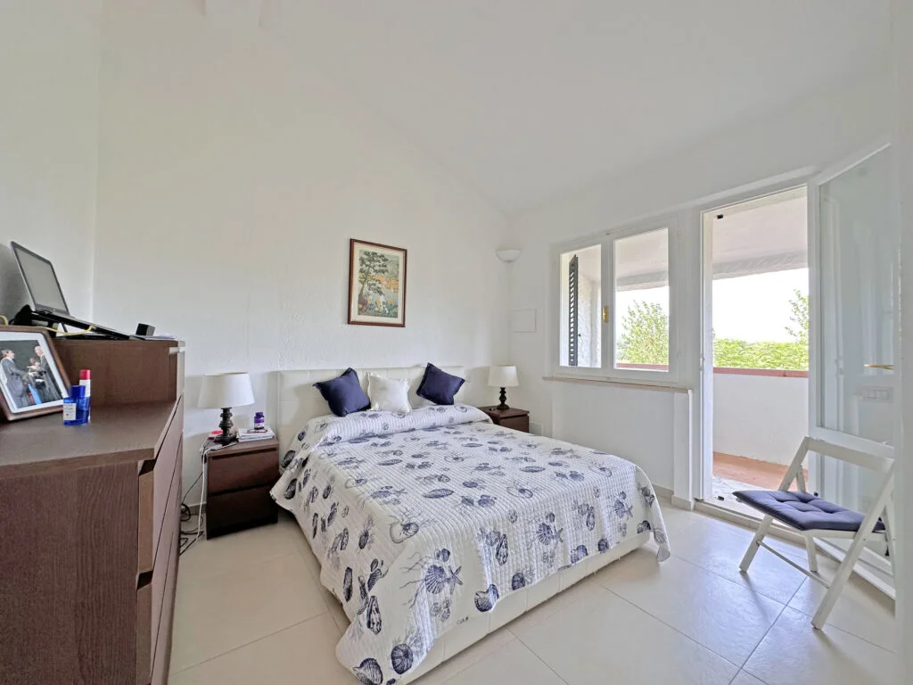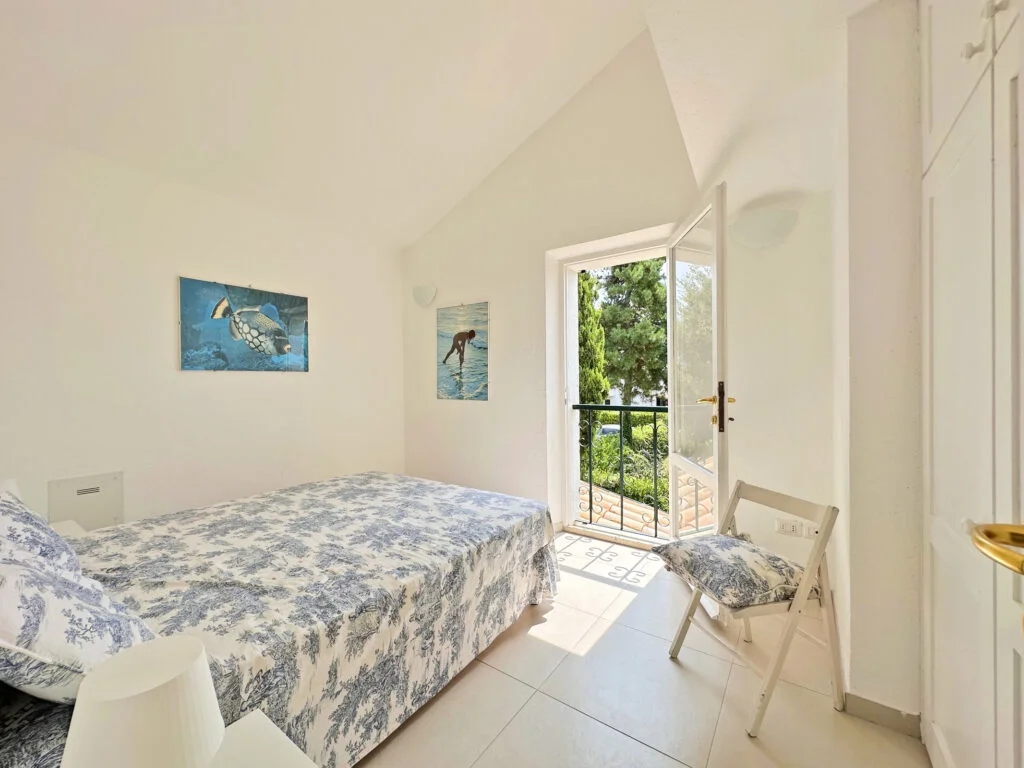 Si presenta all’ingresso con 2 posti auto interni e con un giardino di 500 mq. con doccia esterna.