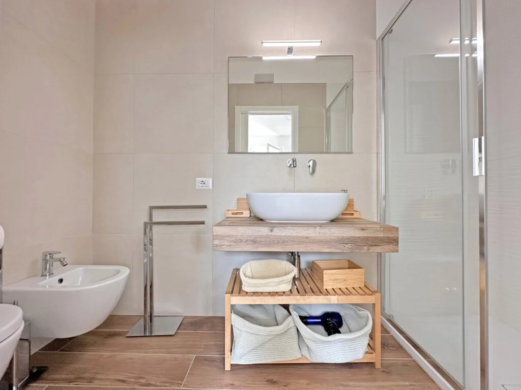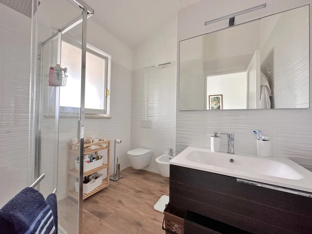 Al 1° piano ha 3 camere matrimoniali con 2 bagni ampi, un terrazzo e una veranda a servizio di una camera.
